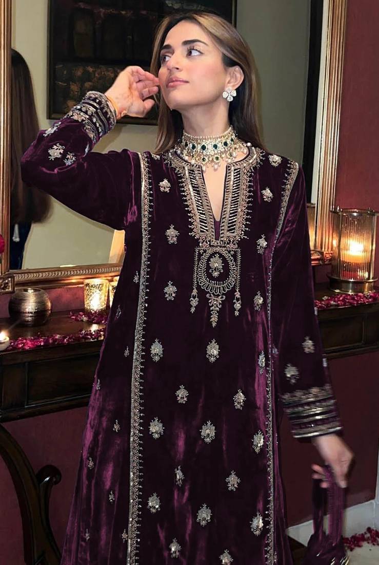 Product Name | Purple Velvet Zari Hand Embroidered Wedding Salwar Kameez Suit | |