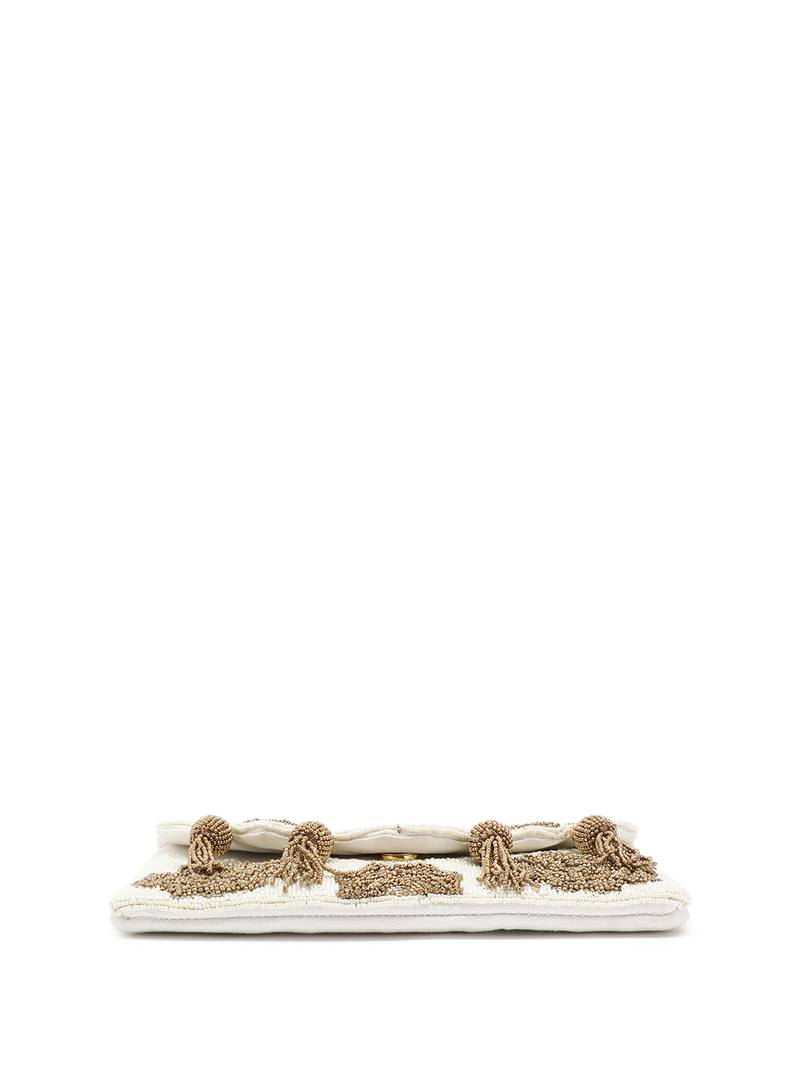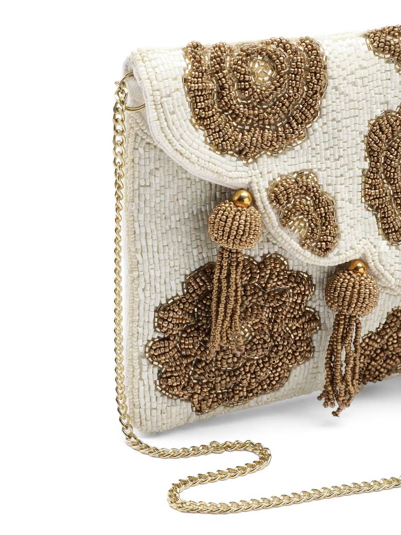 This Anekaant Embellished Sling Bag In Ivory And Metallic Gold Is A Charming Festive Accessory From The Tassel Tales Sling Bag Collection. Made From High Quality Canvas With A Soft Polycotton Lining, It Features A Beautifully Embellished Floral Motif With Intricate Beadwork And Tasselled Accents That Add A Playful Touch. Designed With A Single Main Compartment And A Secure Magnetic Button Closure, It Also Includes An Inner Slip Pocket And A Detachable Chain Strap For Versatile Styling. Lightweight And Easy To Carry, It's Perfect For Festive Occasions. Dimensions (L X H X W): 25 X 16 X 2 Cm.
