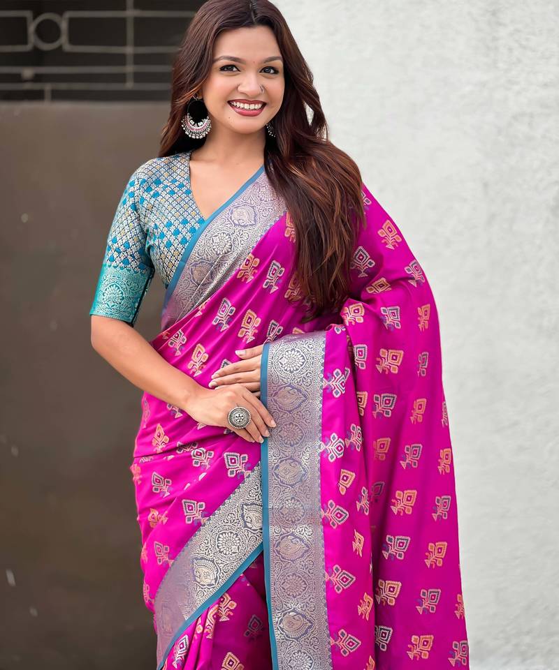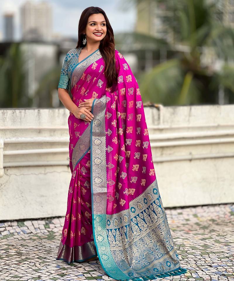Product Description | Experience The Elegance Of Our Soft Silk Patola Saree, Featuring Intricate Meenakari Bandhani Weaves Throughout The Fabric. The Saree Is Enhanced By A Rich, Contrast Zari Woven Pallu That Adds A Luxurious Touch. Complemented With A Brocade Contrast Blouse, This Ensemble Perfectly Balances Traditional Craftsmanship With Sophisticated Style, Ideal For Special Occasions And Celebrations. |