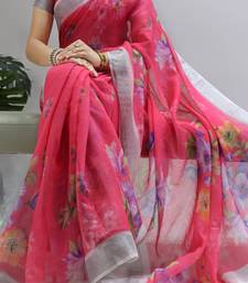 Gajari color all over printed with silver zari border linen saree with unstitched blouse