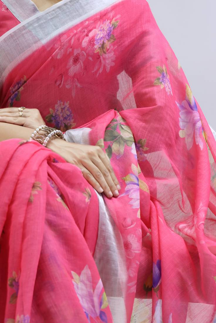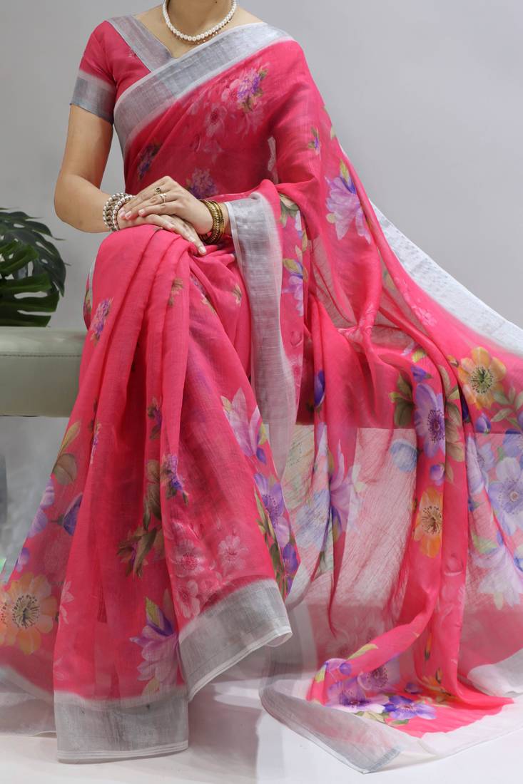 Product Name | Gajari Color All Over Printed With Silver Zari Border Linen Saree With Unstitched Blouse | |