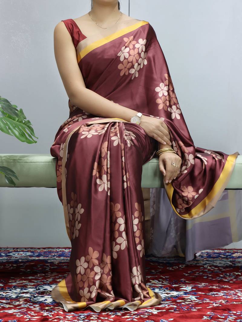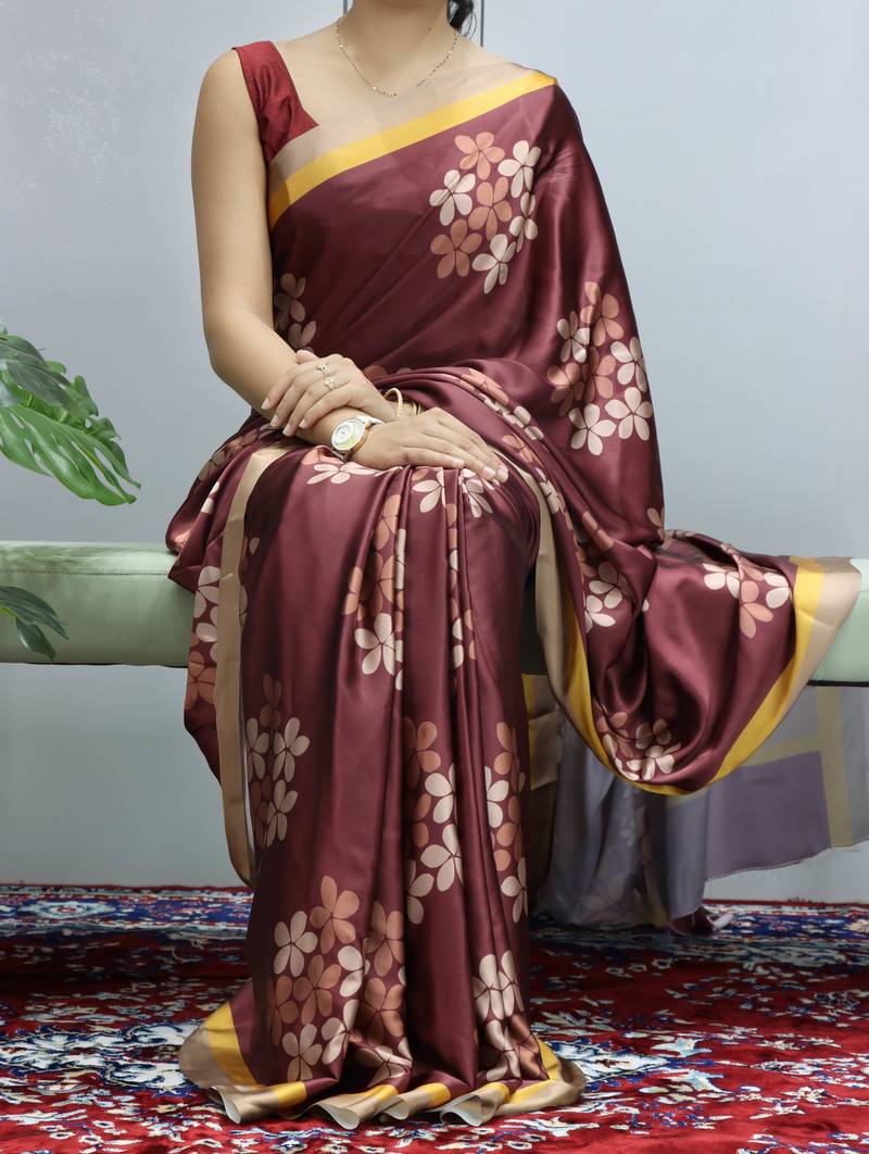 Maroon floral prints heavy japan satin saree with unstitched blouse