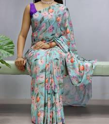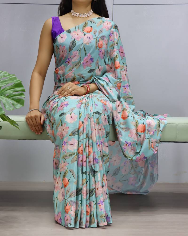 Sky color all over printed silk blend crape saree with unstitched blouse