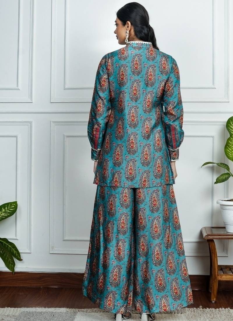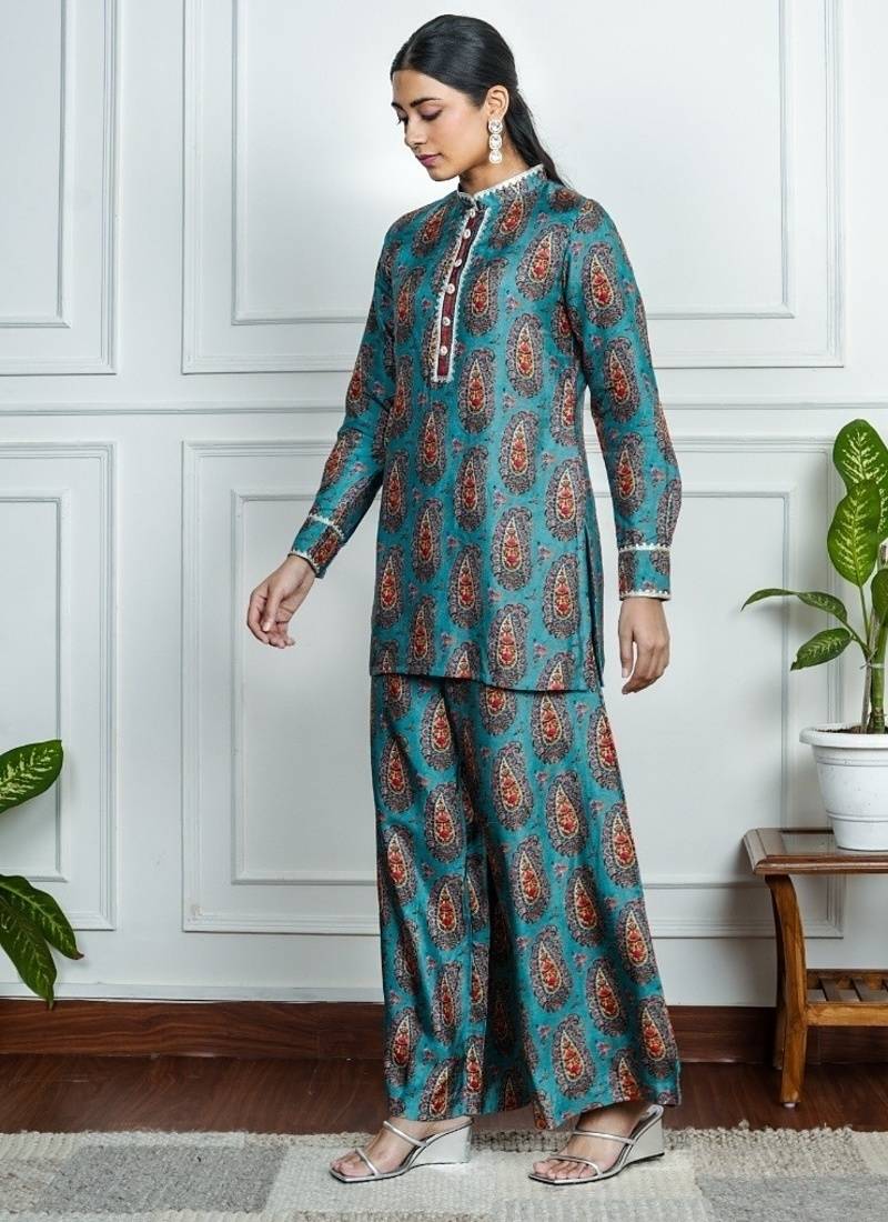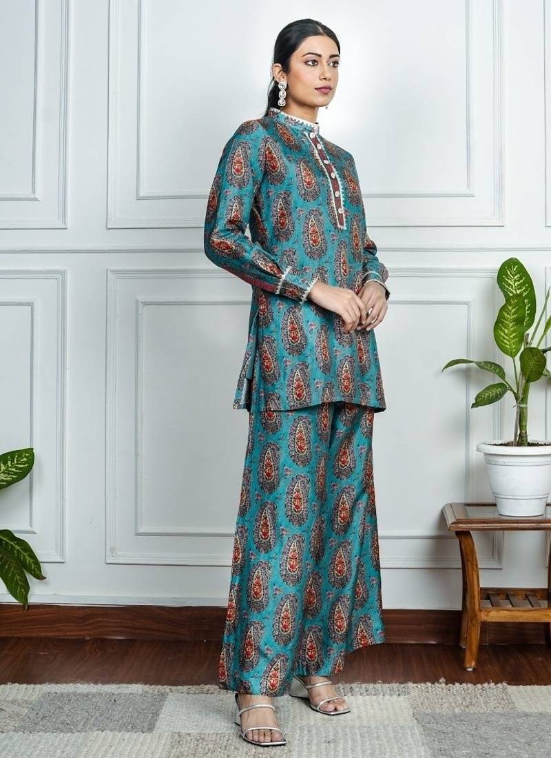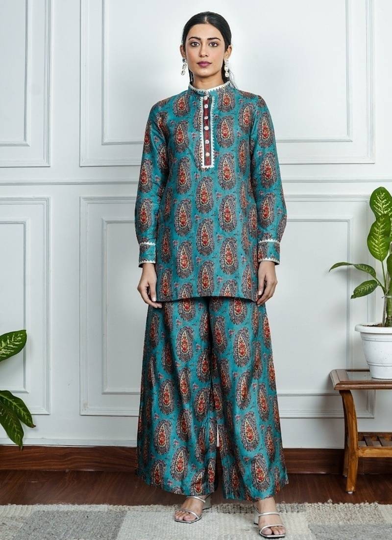 Product Description | This Blue Co Ord Set Is Where Comfort Meets Statement Style. Featuring A Short Kurta Adorned With Bold Orange Floral Motifs And Paired With Matching Straight Pants, It’s Your Fuss Free Choice For Effortless Everyday Dressing Fabric Blue Dola Silk. |