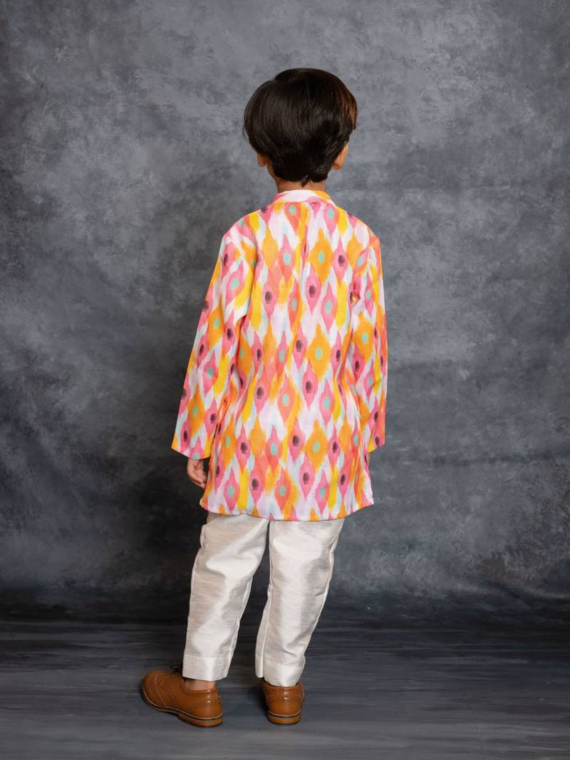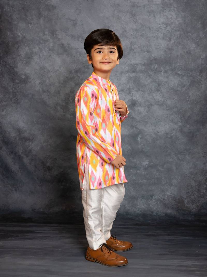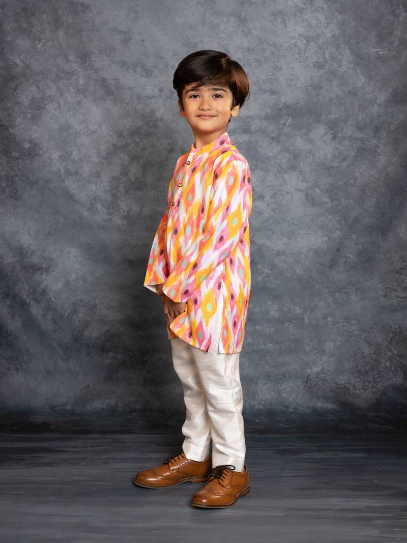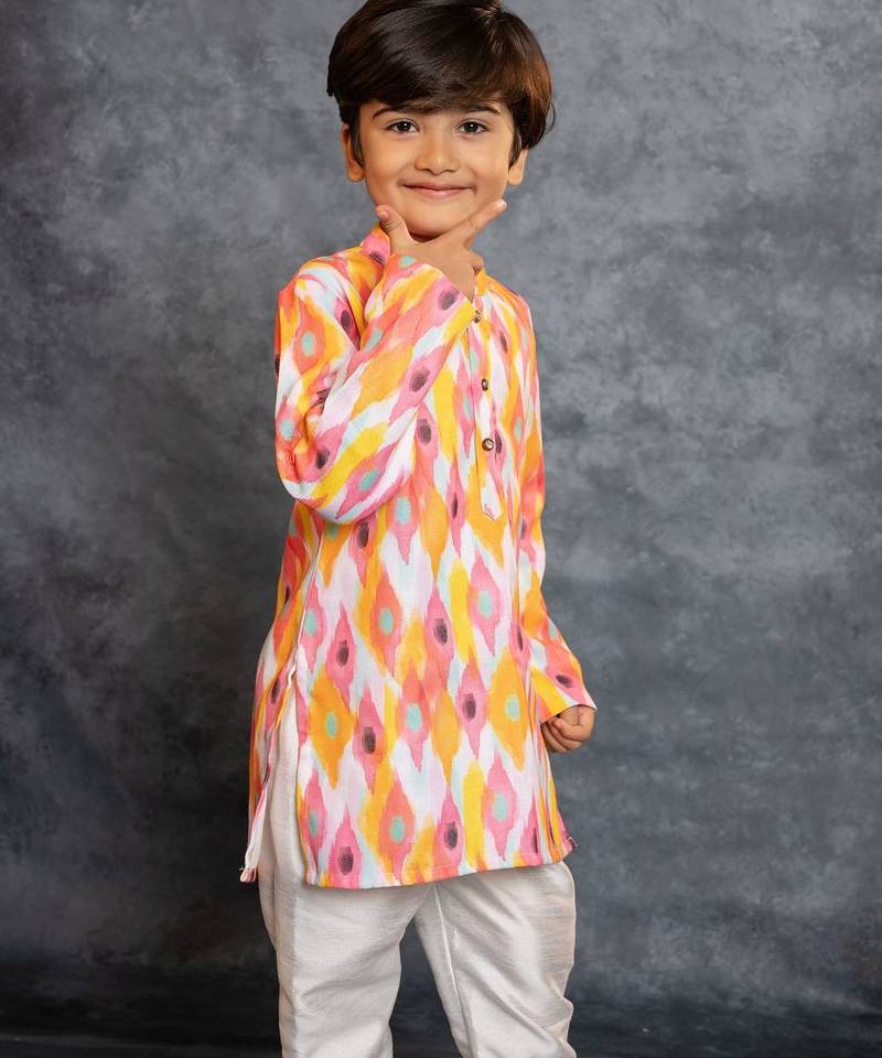 Product Description | Add A Splash Of Color To Your Boy’s Festive Wardrobe With This Kurta Set. Crafted From Breathable Cotton Linen For Day Long Comfort. The Multicolored Digital Print Gives A Trendy And Vibrant Appeal. Comes With Matching Pants For A Complete Ethnic Look. Perfect For Festivals, Weddings, And Traditional Family Gatherings. |