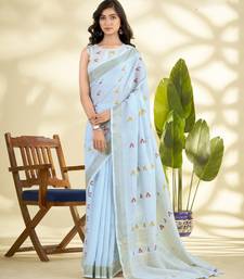 Women's blue linen silk woven saree with unstitched silk blouse piece