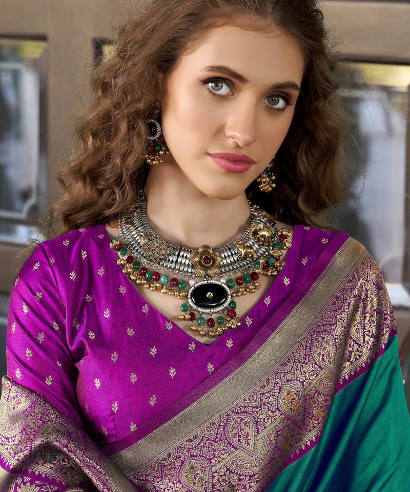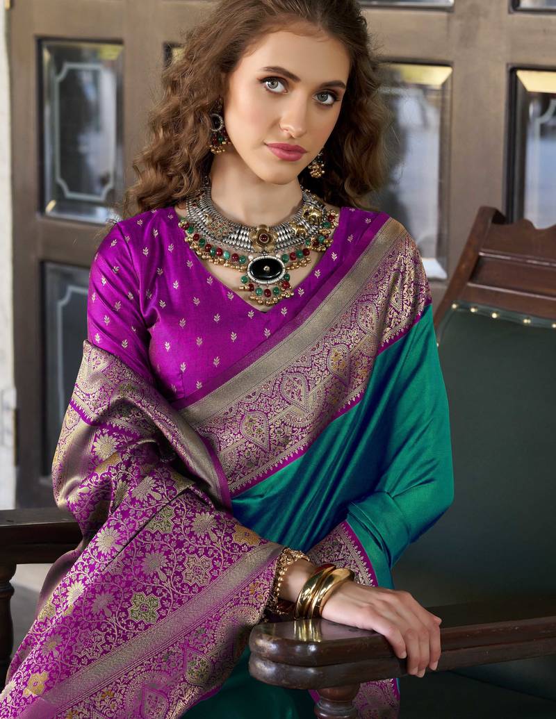 Women's dark green soft silk zari woven saree with unstitched silk blouse piece