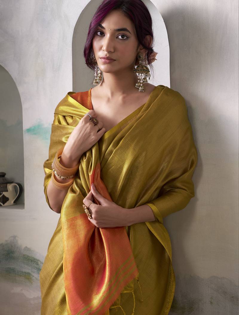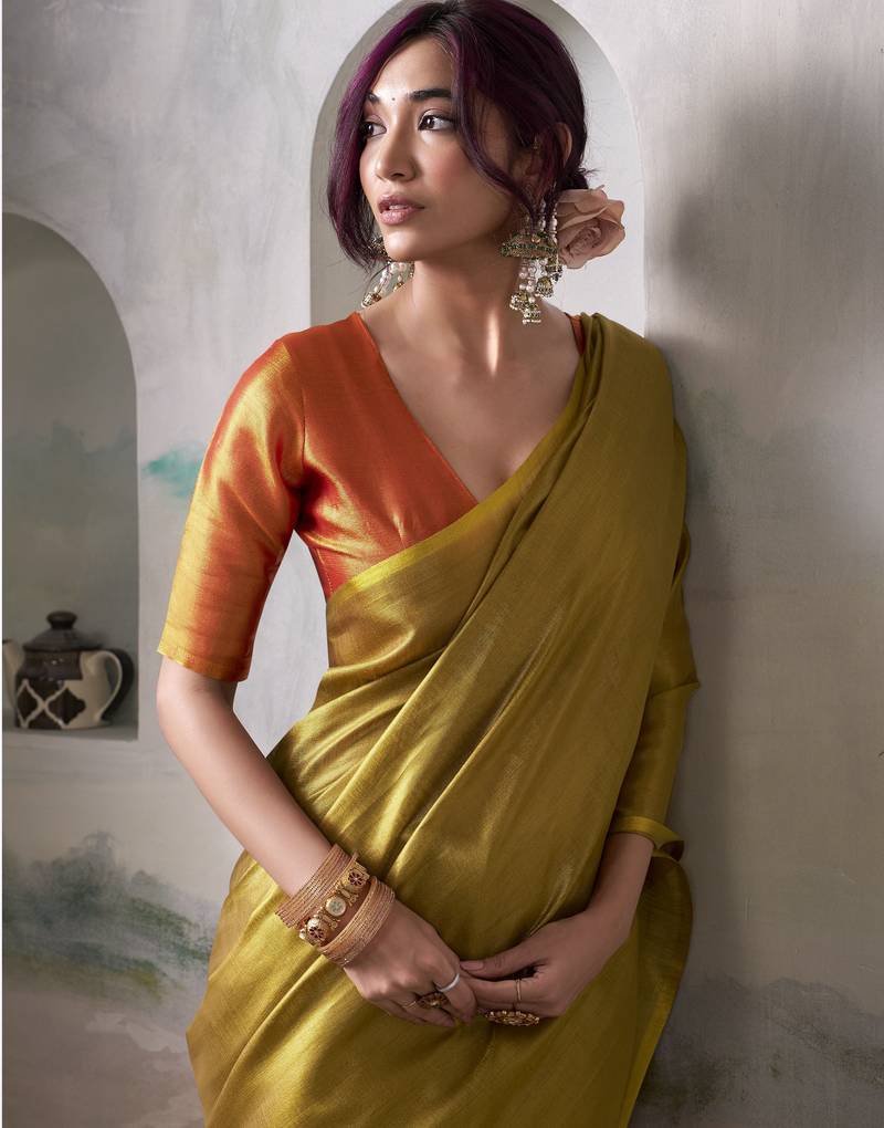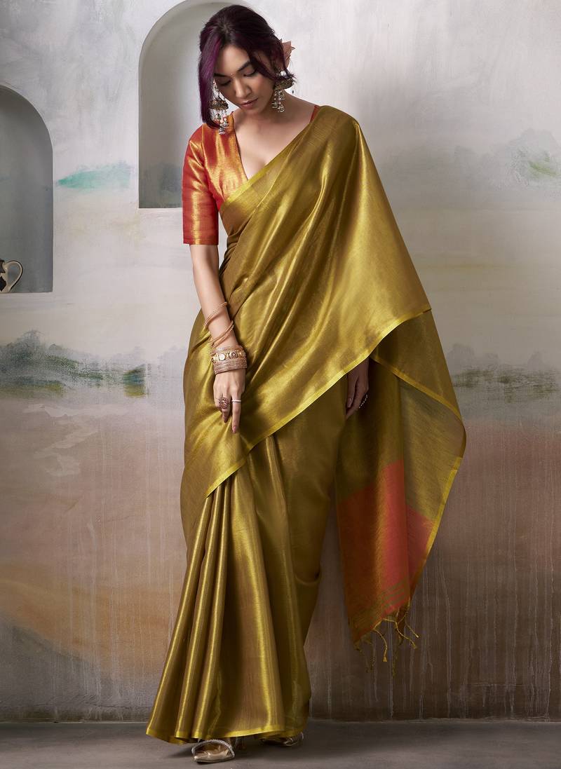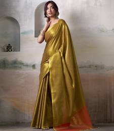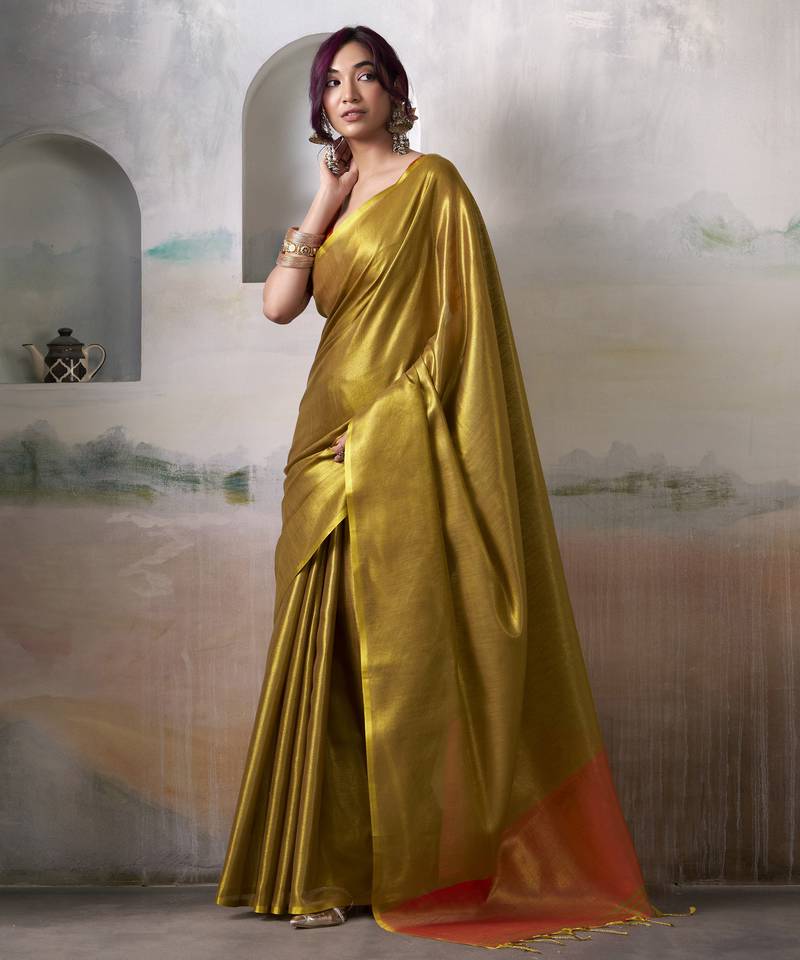 Women's gold tissue silk solid saree with unstitched silk blouse piece
