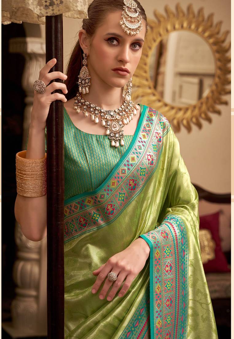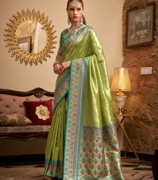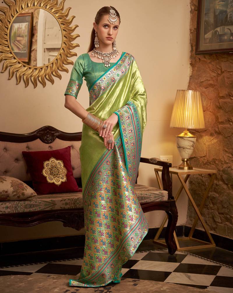 Women's green tissue silk zari woven saree with unstitched silk blouse piece