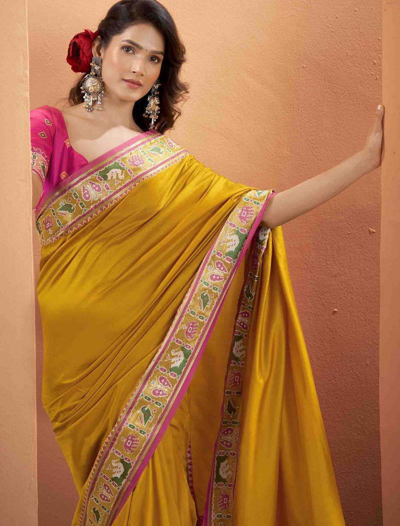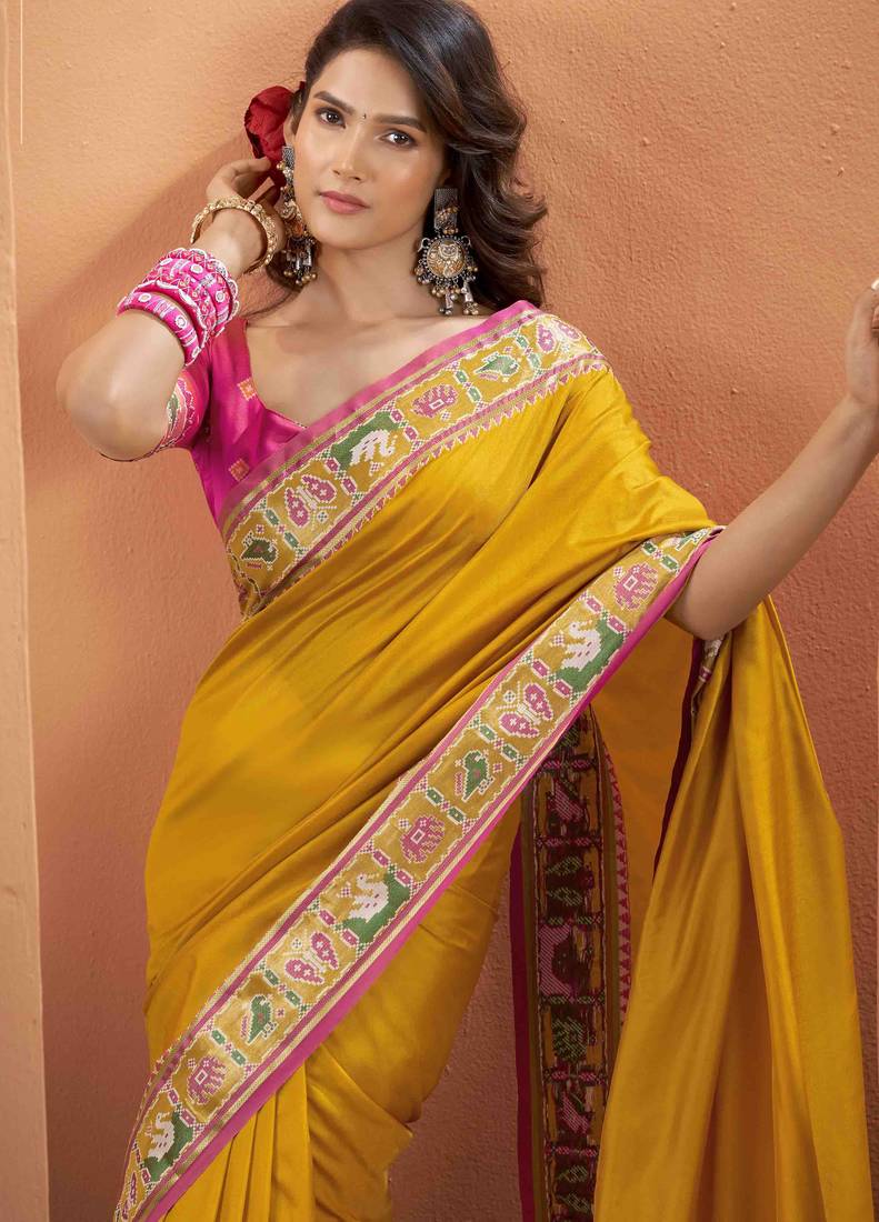 Women's mustard patola silk kalamkari saree with unstitched silk blouse piece