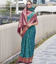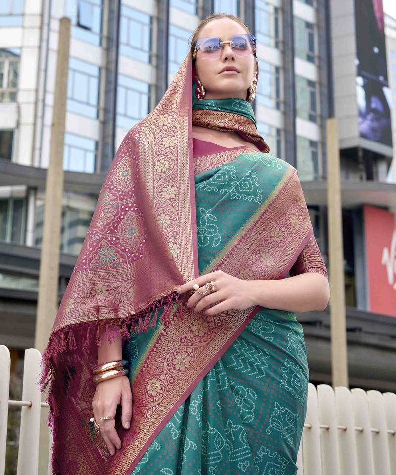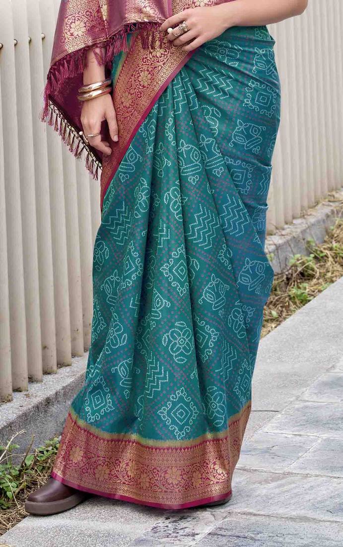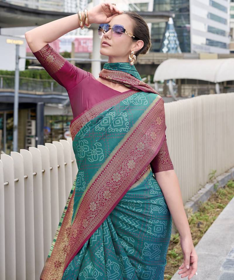 Women's rama soft silk bandhani saree with unstitched silk blouse piece