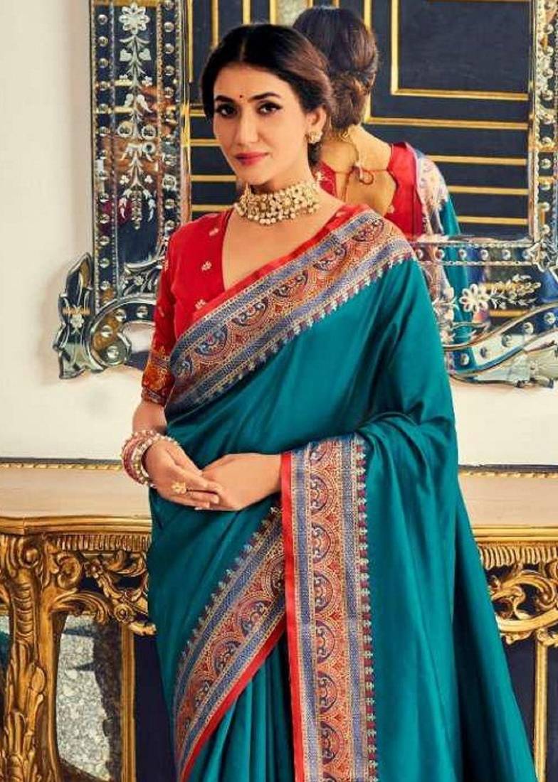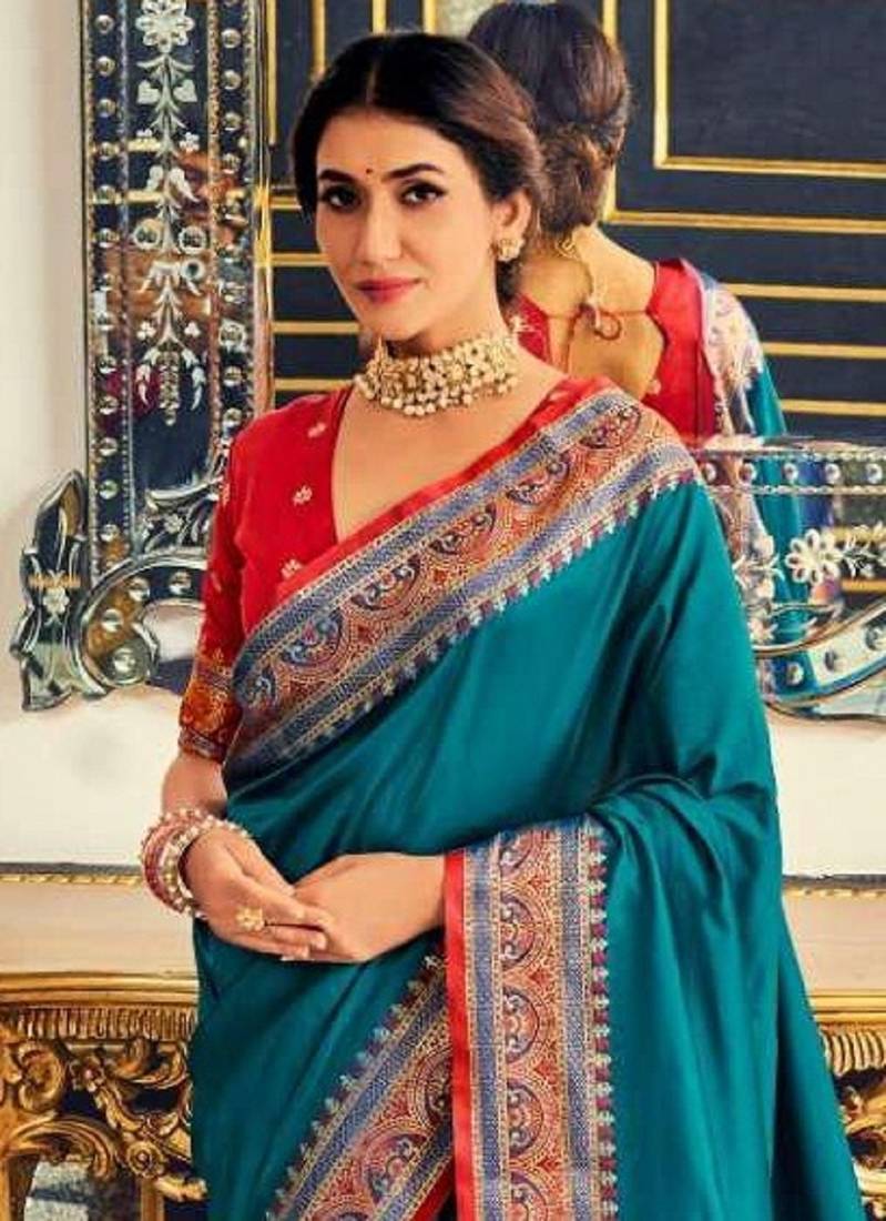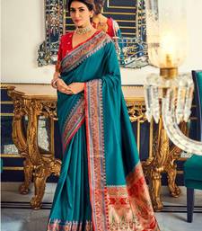 Women's teal soft silk woven saree with unstitched silk blouse piece