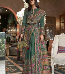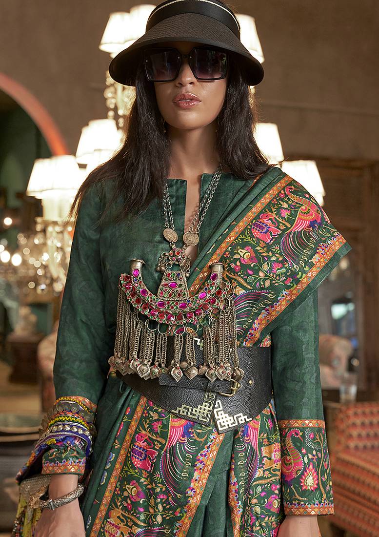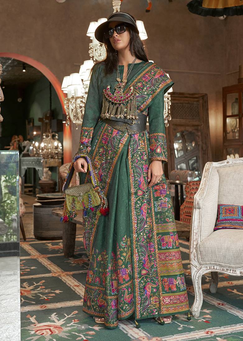 Dark green silk blend printed ceremonial saree