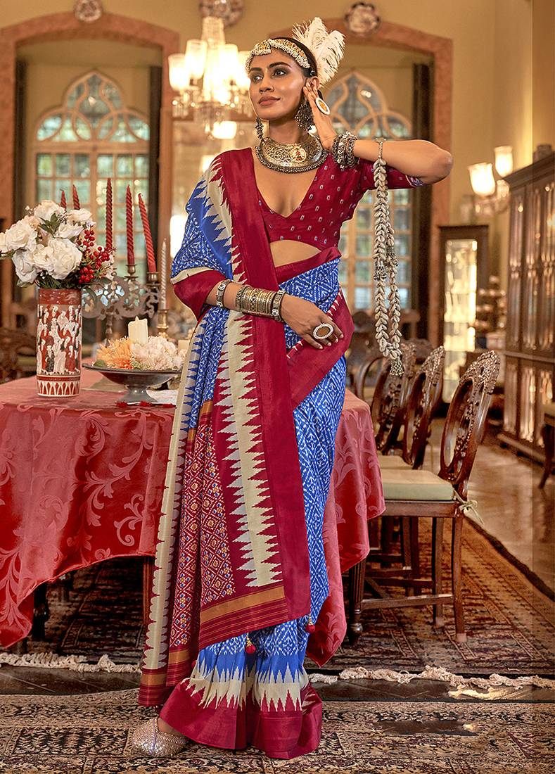 Royal blue & rani pink patola design zari work traditional silk blend saree