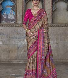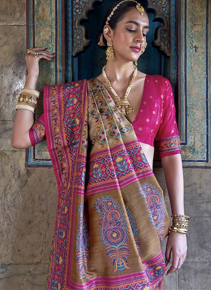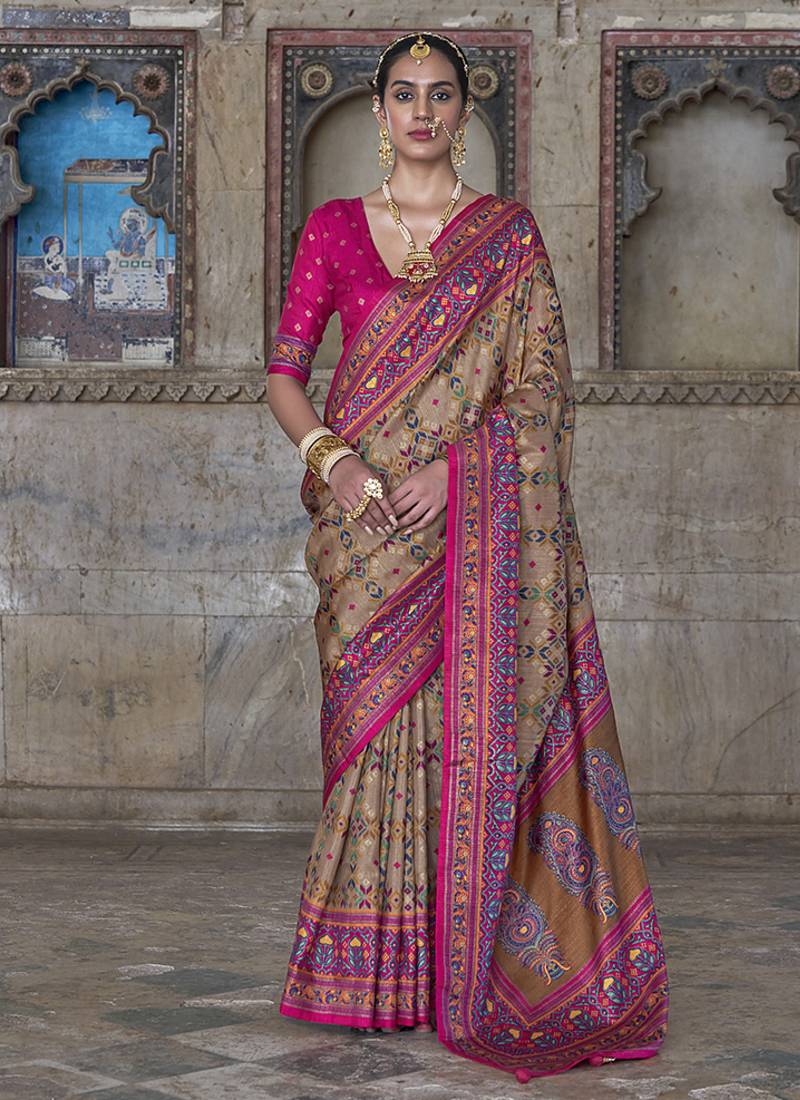 Product Description | Fashion And Trend Would Be At The Peak Of Your Beauty As Soon As You Dresses This Beige And Rani Pink Silk Blend Contemporary Saree. Beautified With Patola Print Work All Synchronized Nicely With The Design And Style And Design Of The Dress. Comes With Unstiched Blouse. |