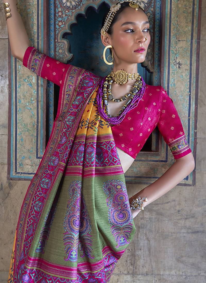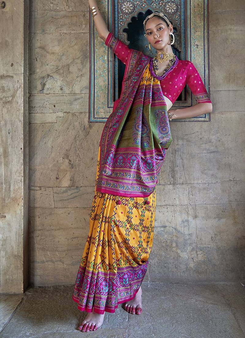 Silk blend yellow and hot pink patola print classic festival wear saree