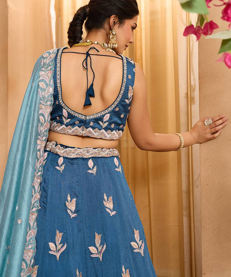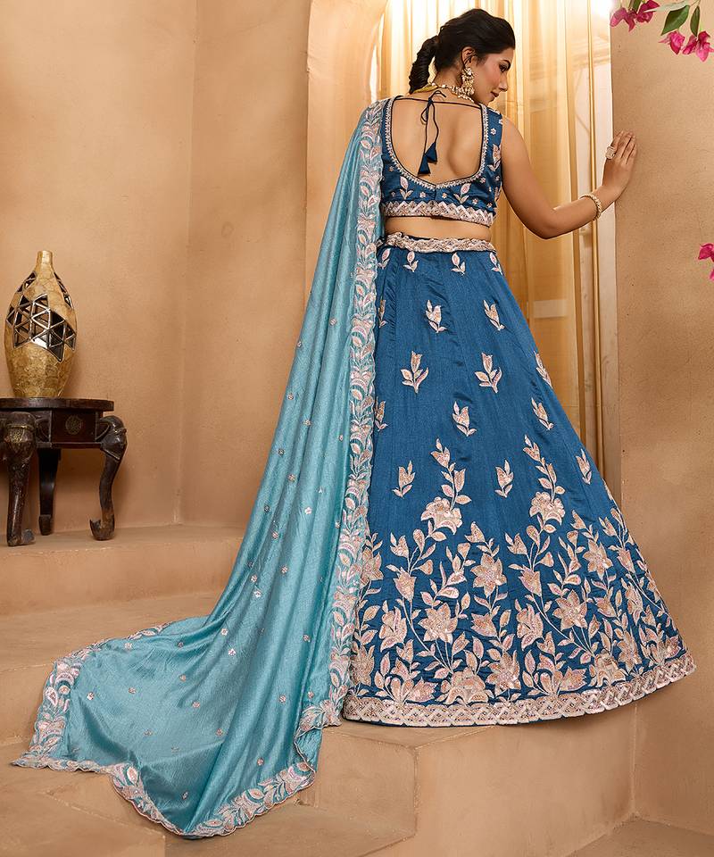 Teal- silk fabric sequins embroidery semi-stitched lehenga & unstitched blouse with dupatta