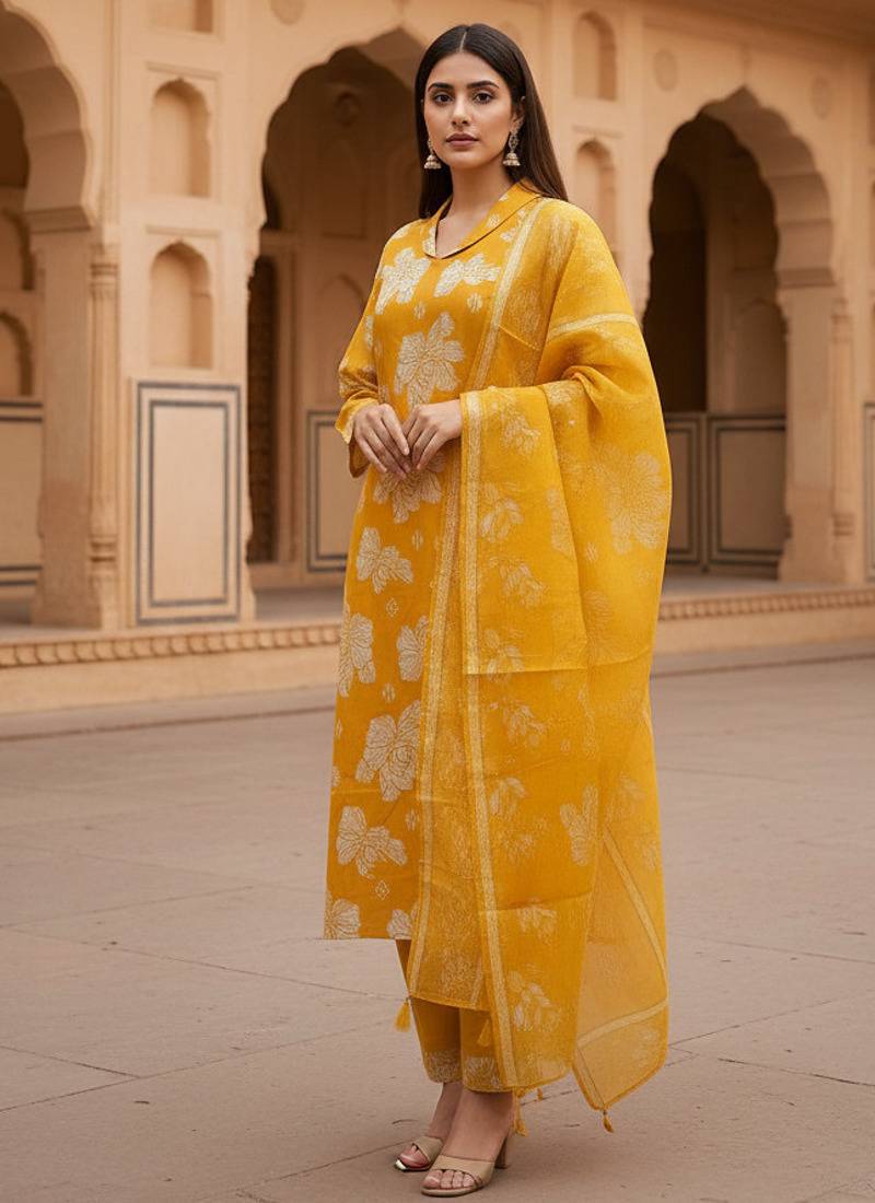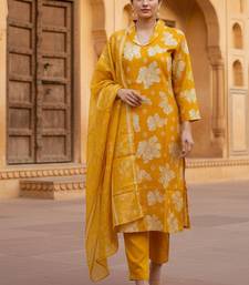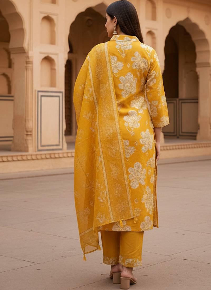 | Product Description | Golden Yellow Cotton Floral Printed Kurta Pant Dupatta Set For Women.
