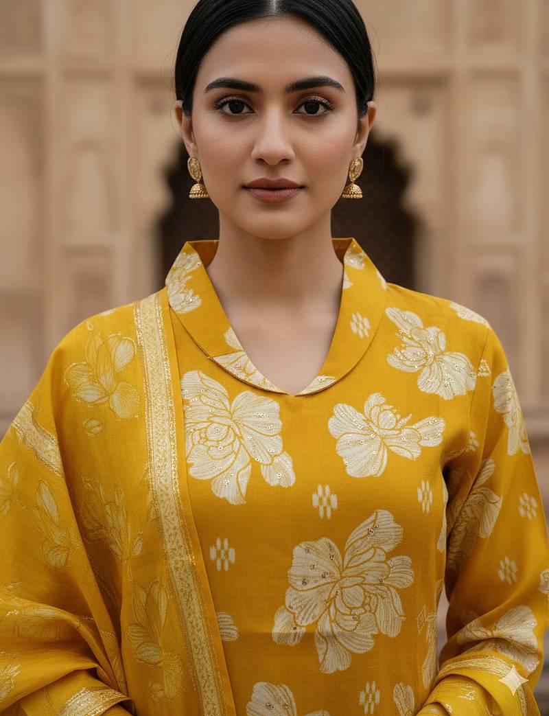 | Product Name | Golden Yellow Cotton Floral Printed Kurta Pant Dupatta Set For Women | |