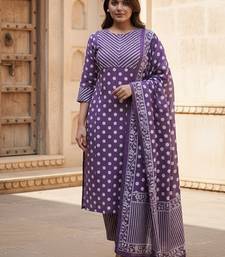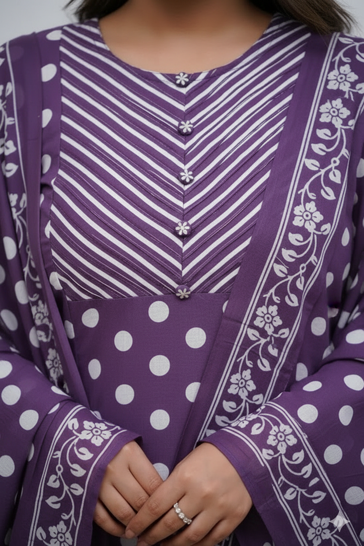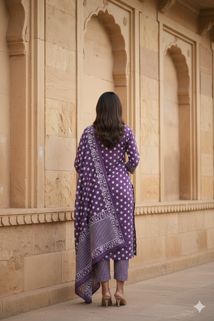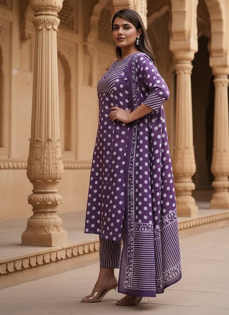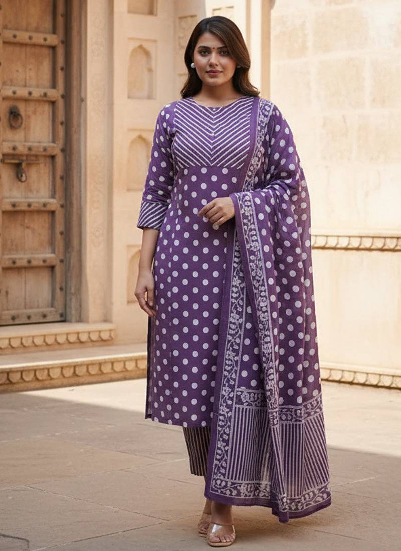 | Product Name | Purple Cotton Polka Dot Printed Kurta Pant Dupatta Set For Women | |
