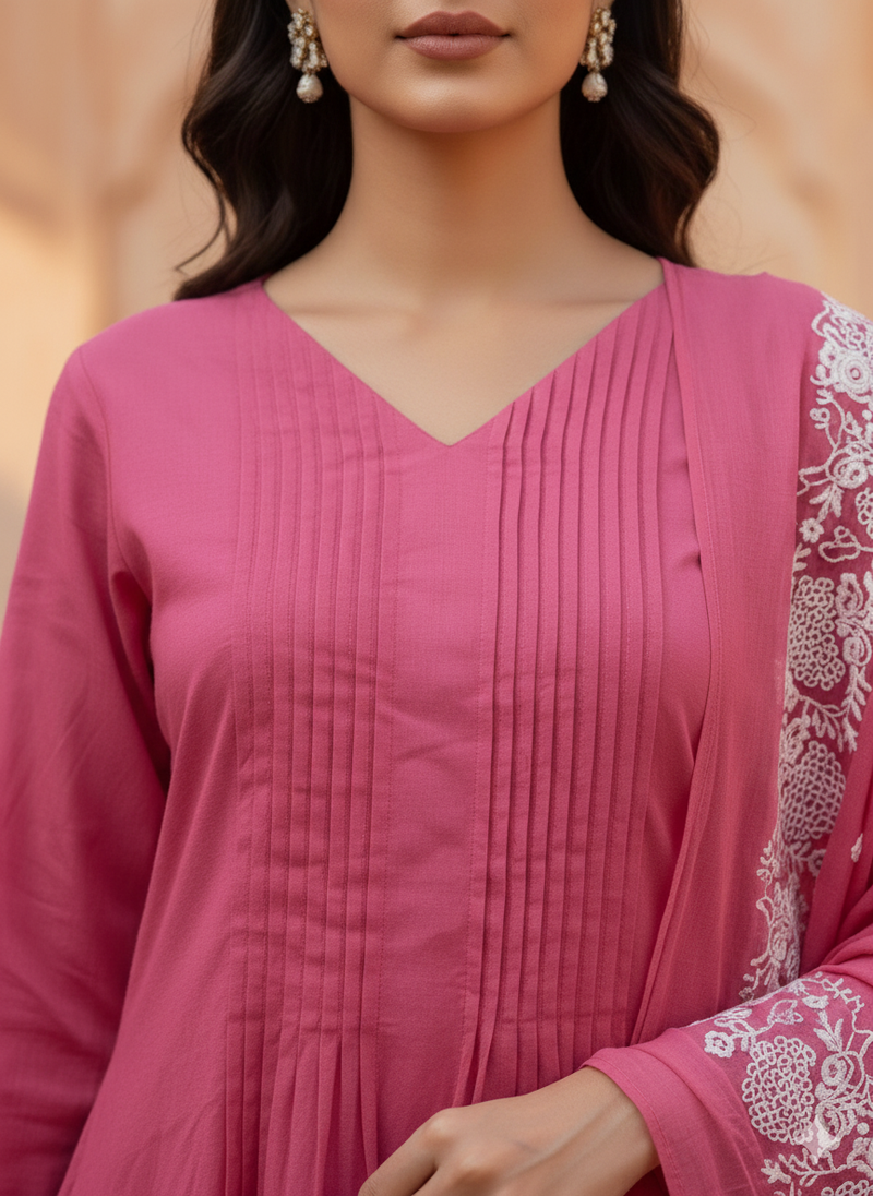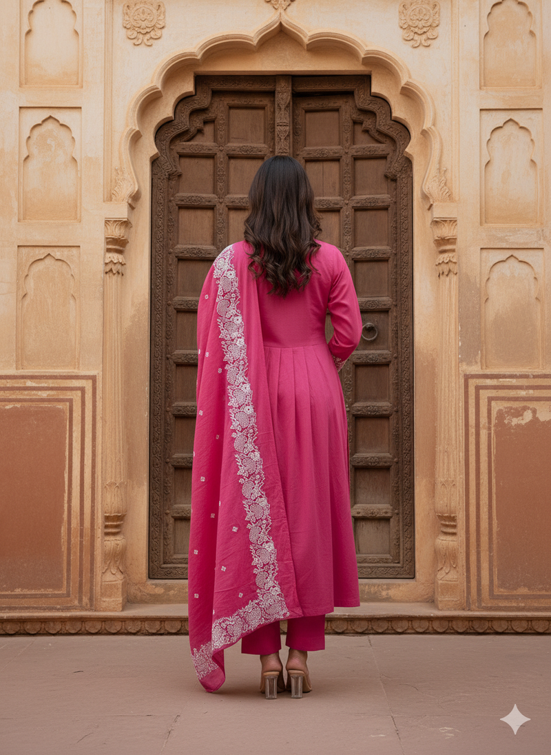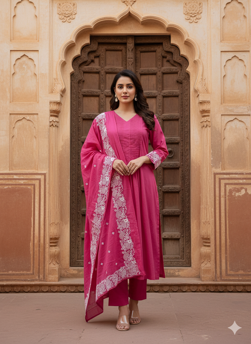 | Product Name | Rani Pink Cotton Embroidered Kurta Pant Dupatta Set For Women | |