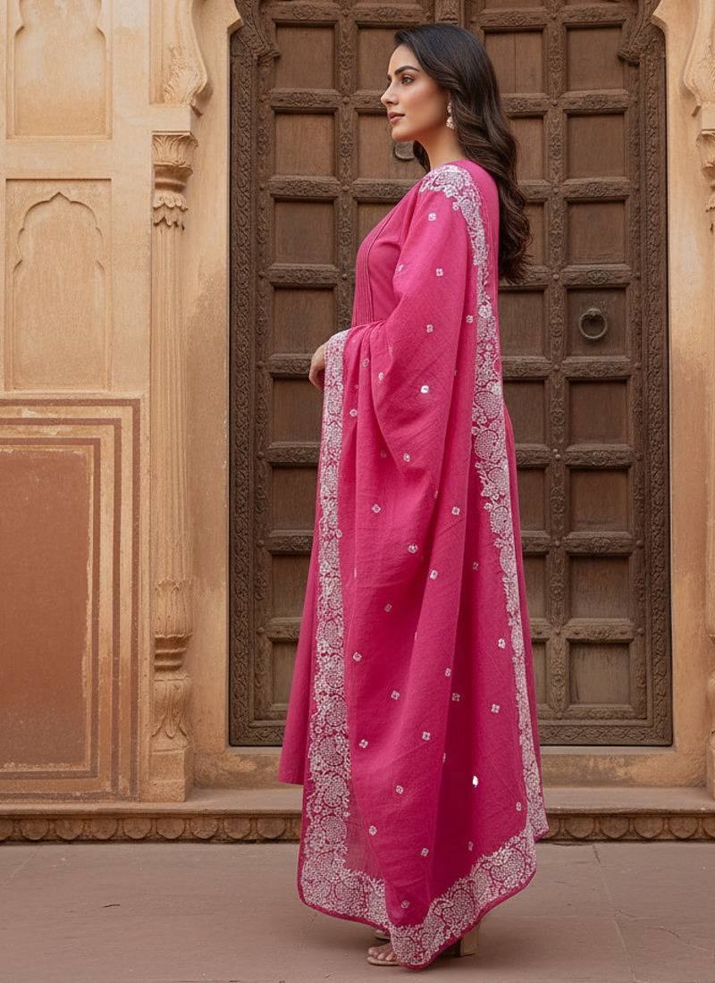 | Product Description | Rani Pink Cotton Embroidered Kurta Pant Dupatta Set For Women.