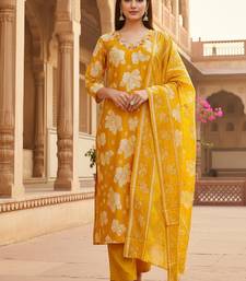Women’s golden yellow cotton floral printed kurta pant dupatta set