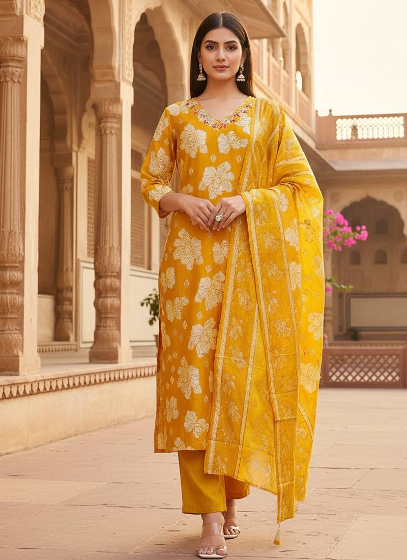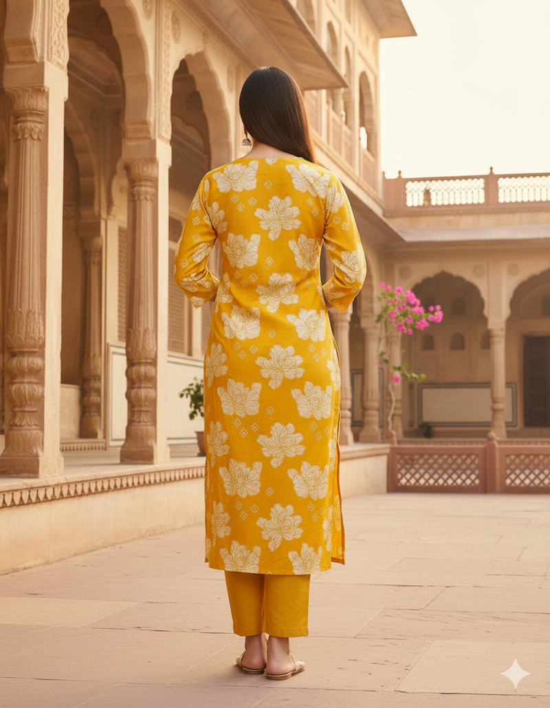 | Product Name | Women’s Golden Yellow Cotton Floral Printed Kurta Pant Dupatta Set | |