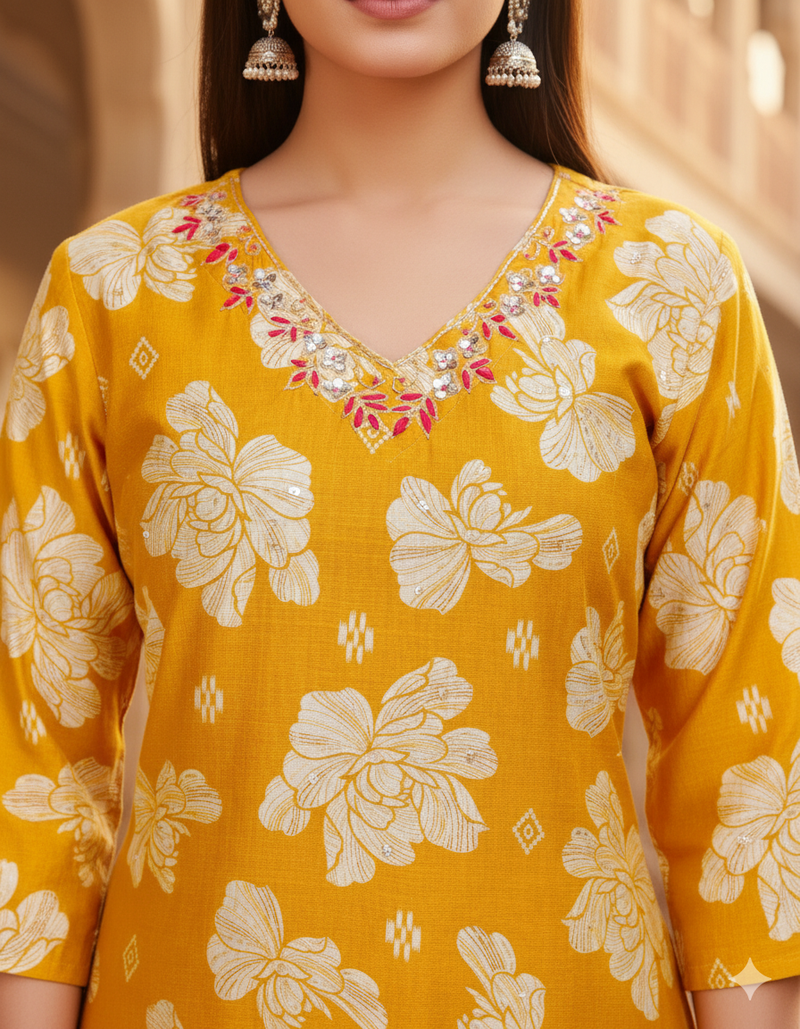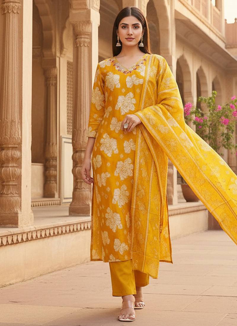 | Product Description | Women’s Golden Yellow Cotton Floral Printed Kurta Pant Dupatta Set.
