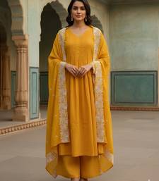 Women’s mustard yellow cotton embroidered kurta pant dupatta set