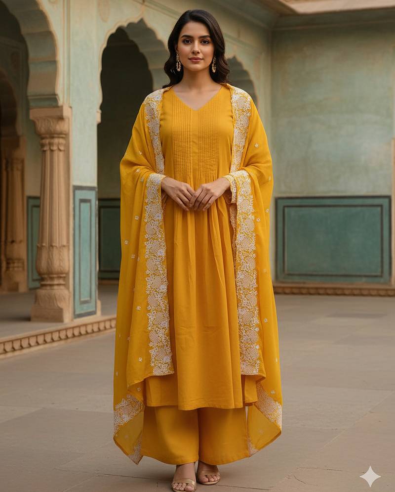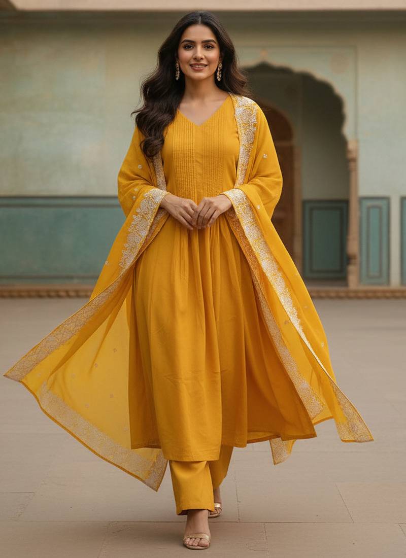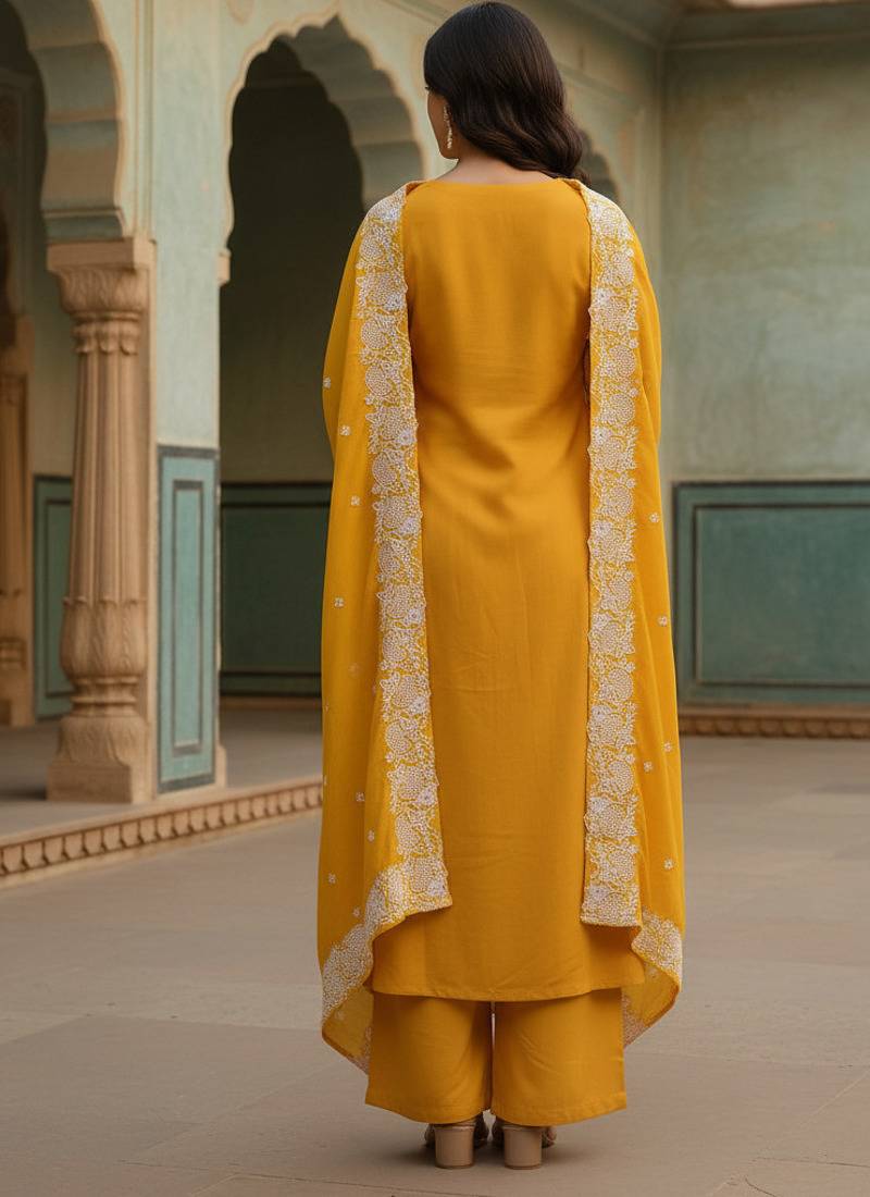 | Product Name | Women’s Mustard Yellow Cotton Embroidered Kurta Pant Dupatta Set | |