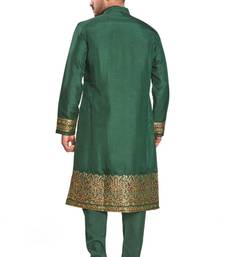 Green hand block printed kurta with embroidery banarsi silk kurta payjama etnic wear :: festive wear